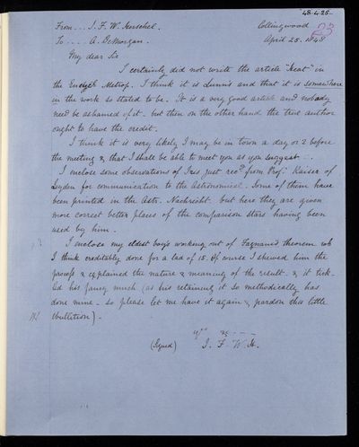 Copy of letter, copied as part of the correspondence project led by Colonel John Herschel FRS following the death of his father. Comments about Augustus De Morgan's work in mathematical functions, and then refers to John Frederick William Herschel's reductions and other astronomical matters, including the need for reform of stellar nomenclature.