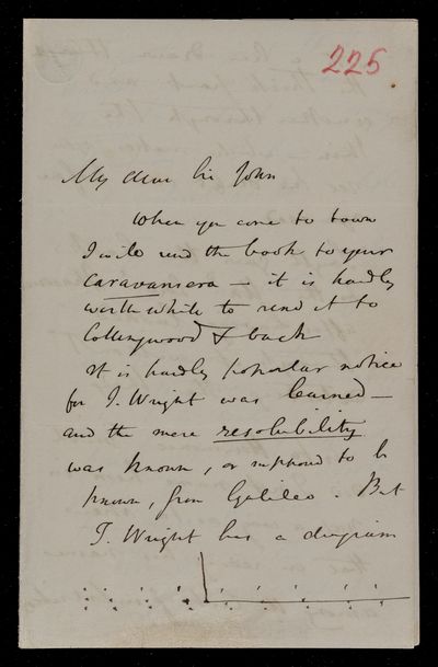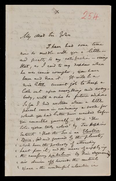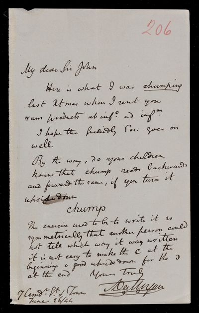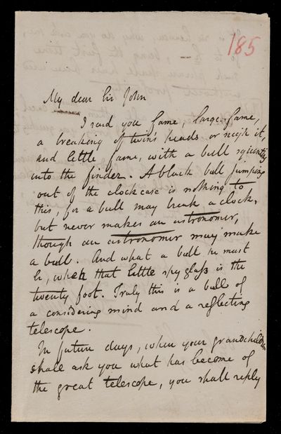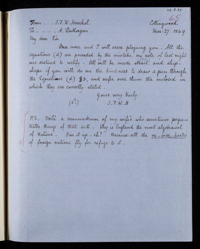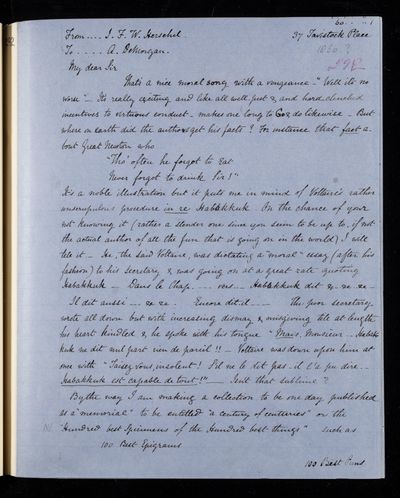 Autograph letter signed by sender. Regarding John Frederick William Herschel's telescope. Includes a rhyme on it.