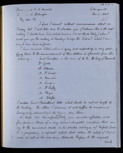 Autograph letter signed by sender. Returns his paper and would be glad to receive an abstract. John Frederick William Herschel has been removed from the Council of the Royal Astronomical Society in deference to his wishes. King of Denmark has offered a gold medal for the discovery of a comet.
