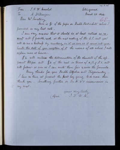 Autograph letter signed by sender. His paper on double stars is required for press so would be grateful if it could be sent along. The society is short of papers for reading so any John Frederick William Herschel can produce would be very welcome.