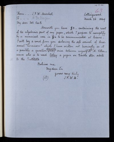 Copy of letter, copied as part of the correspondence project led by Colonel John Herschel FRS following the death of his father. Returns manuscript and corrected proofs of one of John Frederick William Herschel's papers on double stars, with the rest of the paper going to Francis Baily.