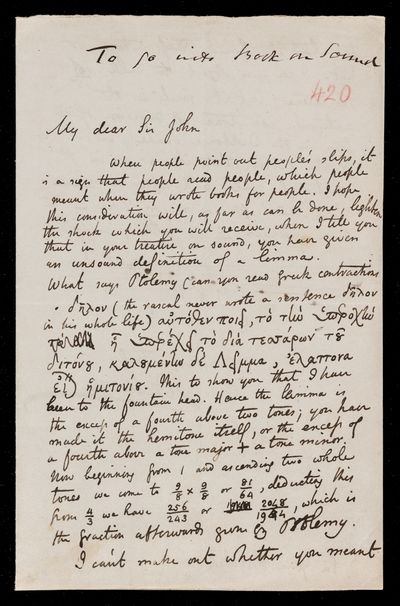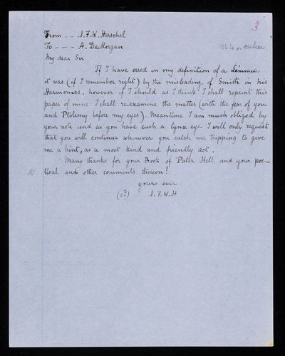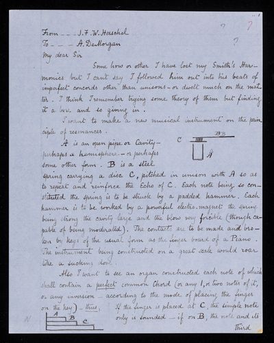 Autograph letter signed by sender. Pointing out an error in one of John Frederick William Herschel's definitions in the treatise on sound.