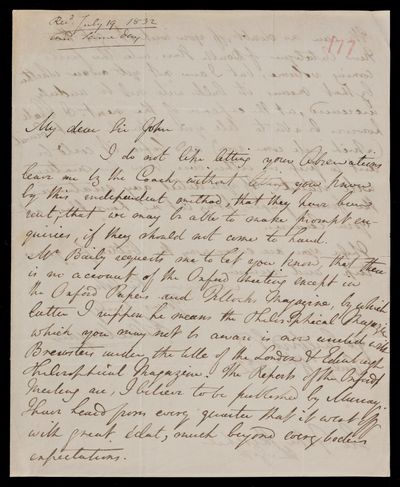 Autograph letter signed by sender. Has sent off his observations by the coach. Account of the Oxford meeting is in Tilloch's Magazine, now amalgamated with David Brewster's Edinburgh Journal. Will be able to include the new catalogue of stars in the forthcoming volume if John Frederick William Herschel desires it.
