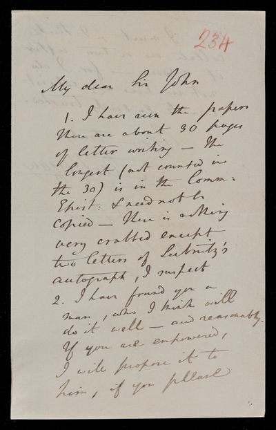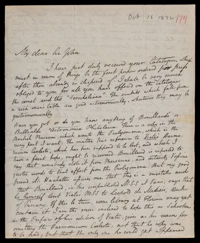 Autograph letter signed by sender. Has received the catalogue and it will be sent to the press. Is grateful for John Frederick William Herschel's offers. Does he know anything of Bullialdi's (Ismael Boulliau) Astronomica philolaica? Refers to Franciscus Vièta's Harmonicum coeleste. 25 copies of John Frederick William Herschel's latest paper has been forwarded.