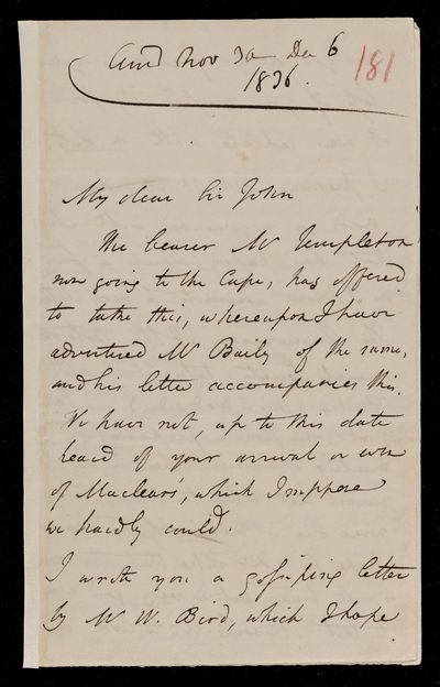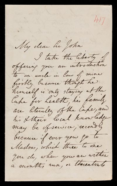 Autograph letter signed by sender. Introducing an uncle-in-law who is residing at the Cape for health reasons. Normally lives at Madras and may prove useful to John Frederick William Herschel should he visit Madras.