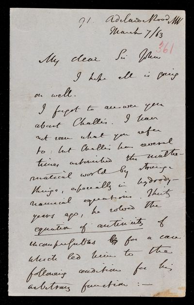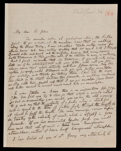Autograph letter signed by sender. Possible to purchase 12 postage covers for 11d in the Strand. Points out an apparent error in one of John Frederick William Herschel's books on sound. How does an open pipe vibrate? Regarding the private character of J. L. Lagrange.