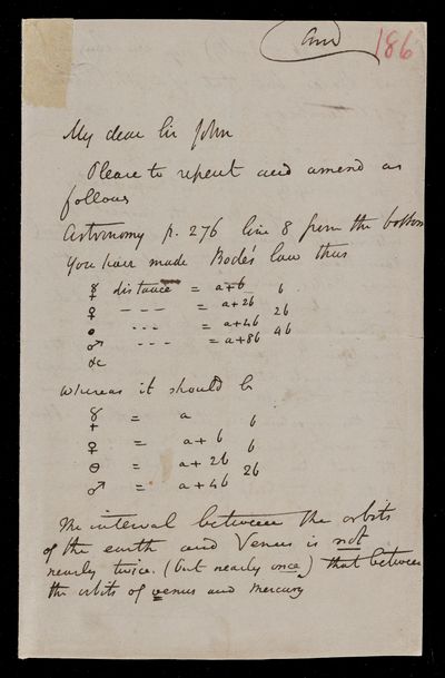 Autograph letter signed by sender. Points out an error John Frederick William Herschel has made concerning J. E. Bode's law. What is the proper notation for the satellites?