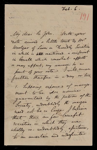 Autograph letter signed by sender. Has just had a tract on Friendly Societies from J. W. Woolgar. Answers some queries regarding the work of such societies.