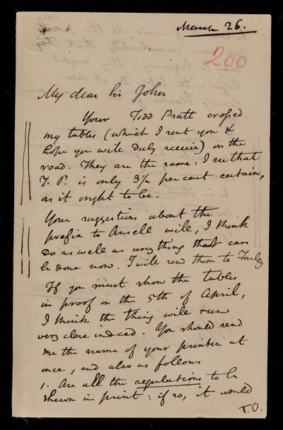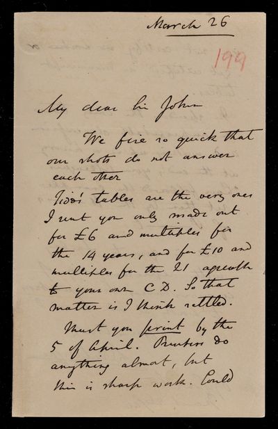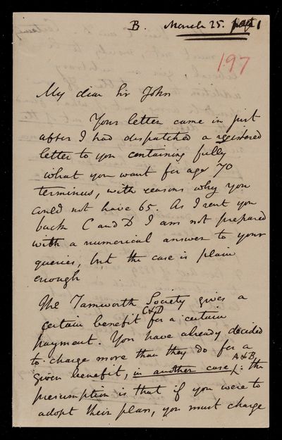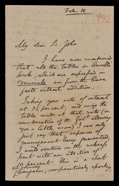 Autograph letter signed by sender. Sending more [life] tables. No age 65 in Charles Ansell's tables. Gives further advice on the running and financing of Friendly Societies.