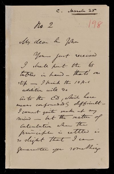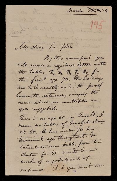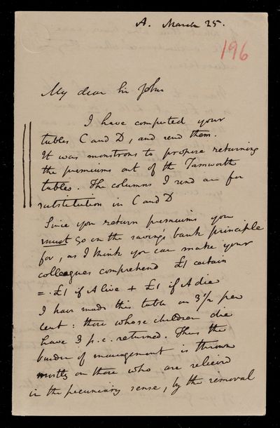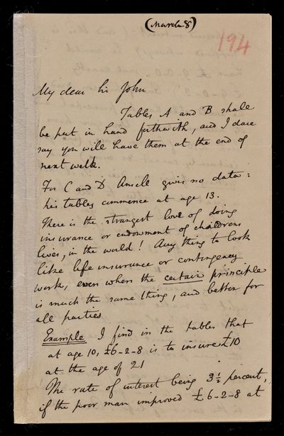 Autograph letter signed by sender. Is working on tables A and B. Further regarding Charles Ansell's life tables.