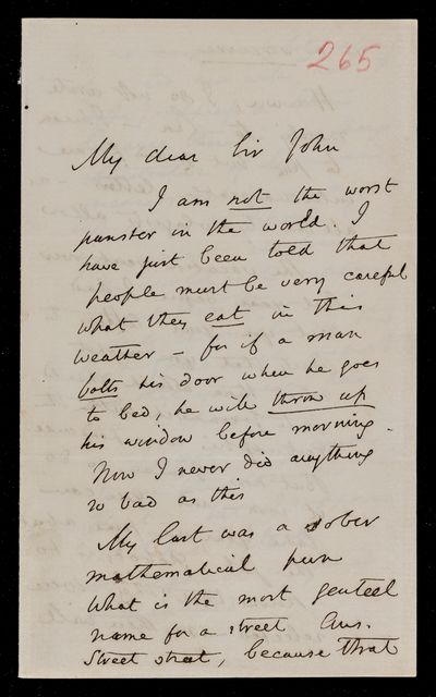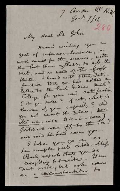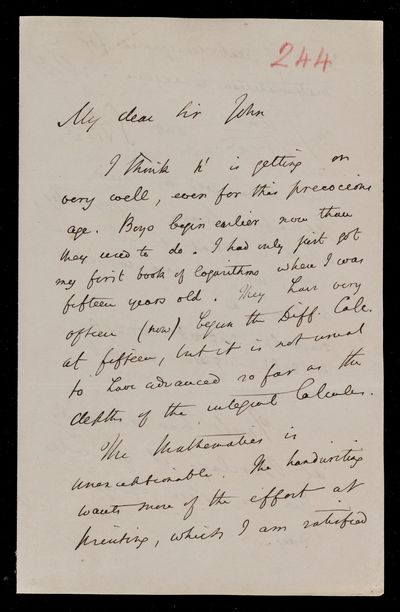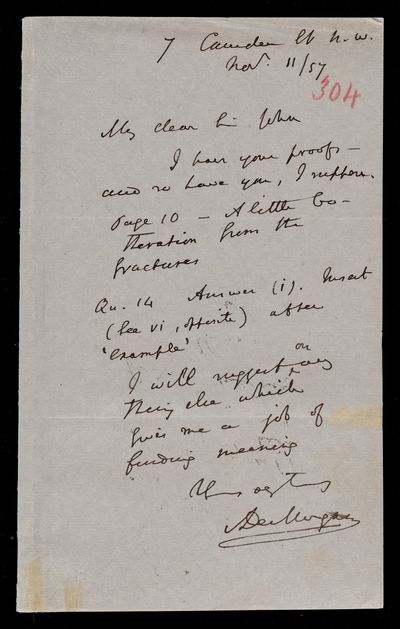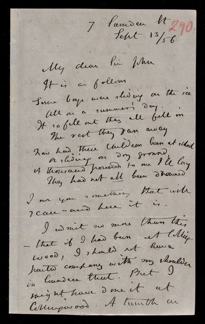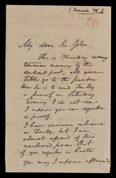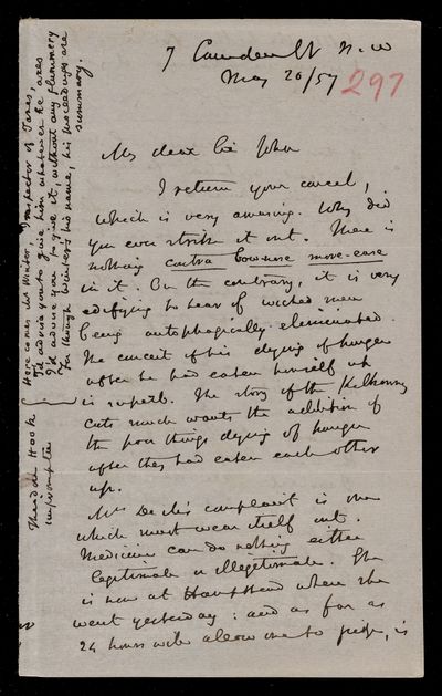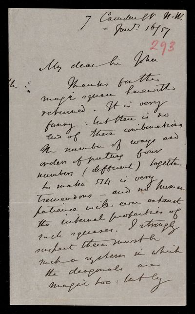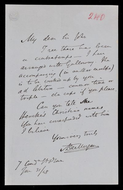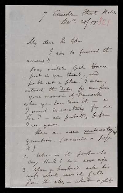 Autograph letter signed by sender. Has managed to write out the song and insert the Blaise Pascal verse. Gave some advice to an Assurance Office yesterday, so he must be improving. Illness in his family this season has taken the form of great prostration. Gives curious confirmation of Isaac Newton's lack of knowledge of French. Blaise Pascal affair is growing into an epic.