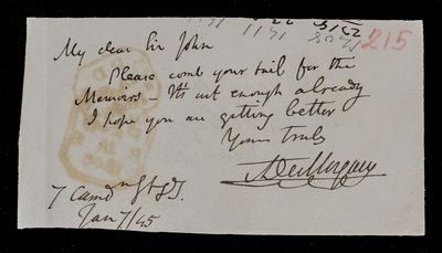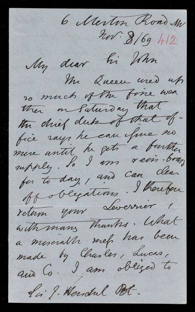 Autograph letter signed by sender. Regarding a mistake in his old address. Hopes U. J. J. Leverrier will arrive safely after all. Cold weather is bracing him up.