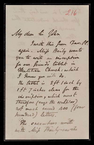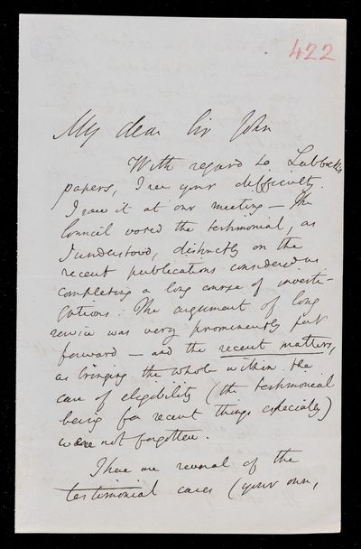 Autograph letter signed by sender. Regarding a citation for J. W. Lubbock's award.