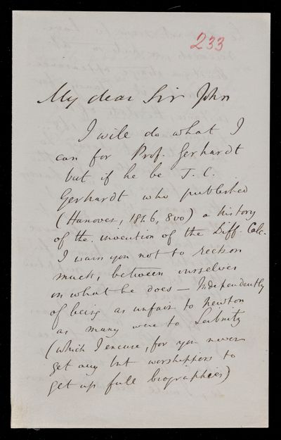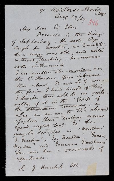 Autograph letter signed by sender. Regarding David Brewster and the inaccuracies in his life of Isaac Newton.