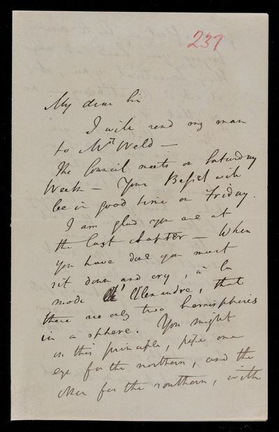Autographed letter . Progressing slowly. Knows nothing about C. M. Hall or the whereabouts of his telescopes. Regarding the London Institution. Sees that U. J. J. Leverrier has been dismissed.