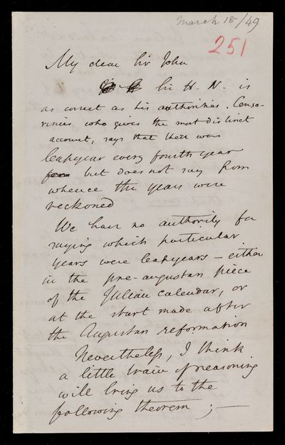 Autograph letter signed by sender. John Frederick William Herschel's letter lays terrible responsibilities at his door. Should not neglect the offer. Regarding the Julian calendar.