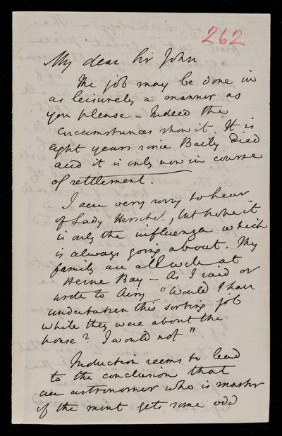 Autograph letter signed by sender. Will be a great reception for John Frederick William Herschel when he returns. Is working on a theory of probabilities. Francis Baily is the man for mapping the entire heavens. G. B. Airy is to test John Frederick William Herschel's topsy-turvy observations of Orion.