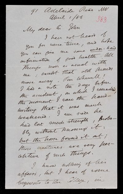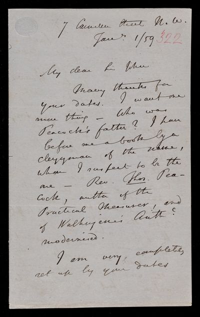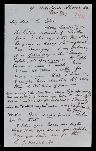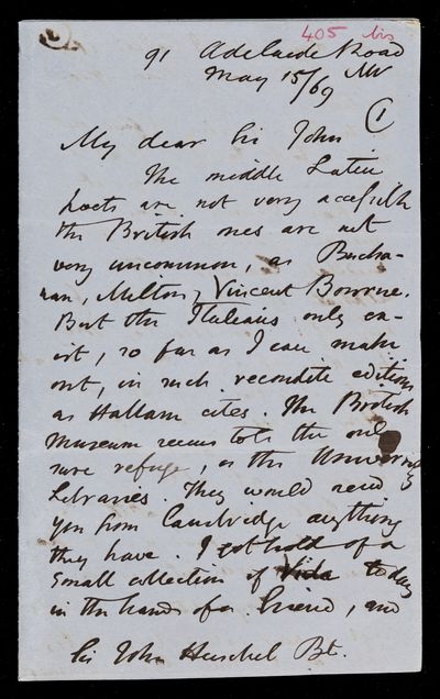 Autograph letter signed by sender. Regarding middle Latin poets and similar English ones. Hopes John Frederick William Herschel's health improves with the advent of Spring.