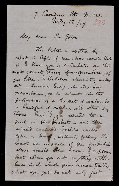 Autograph letter signed by sender. Regarding the task of sorting his books. All W. H. Smyth's daughters are married; wait until the last one of John Frederick William Herschel's is married. Has had a letter from W. R. Hamilton. Heat has been dreadful.