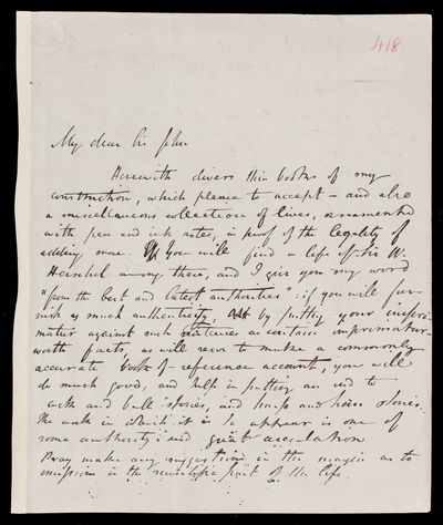 Autograph letter signed by sender. Sending various tracts and a miscellaneous collection of lives. Would he look at the life of William Herschel and make any alterations or corrections as he sees fit.