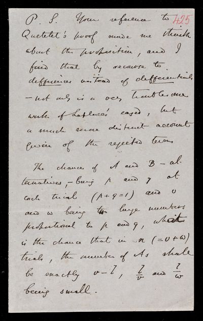 Detached postscript of a letter, autographed. Regarding a proof of L. A. J. Quetelet and the proposition that arises from it. Wife is nursing her mother.
