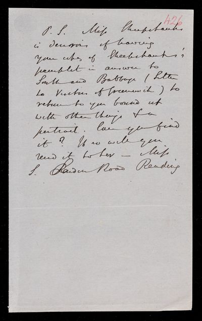 Detached postscript of a letter, autographed. Anne Sheepshanks would like John Frederick William Herschel's copy of Richard Sheepshanks's pamphlet in answer to James South and Charles Babbage, to bind with other things and return it to John Frederick William Herschel.