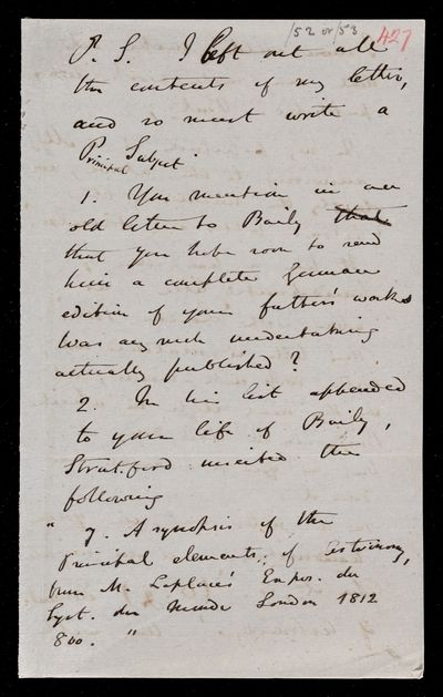 Detached postscript of a letter, autographed. Did the German edition of William Herschel's works ever materialize? Was Francis Baily's Synopsis of Laplace's Principal elements of Astronomy published? Gives a query regarding the possibility of the latter.