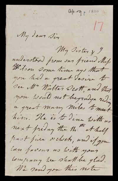 Autograph letter signed by sender. Invitation to dine with them and Sir Walter Scott.