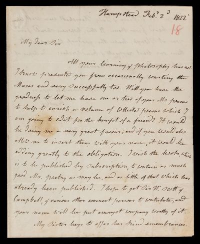 2 February 1822 Sender: Joanna Baillie Reference number: HS/3/18