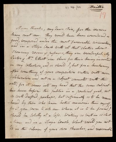 27 April 1822 Sender: Joanna Baillie Reference number: HS/3/19