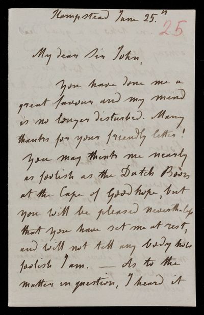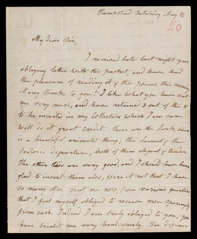 18 May 1822 Sender: Joanna Baillie Reference number: HS/3/20John Frederick William Herschel receives the Bakerian Medal of the Royal Society.
