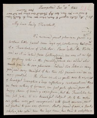 Autograph letter signed by sender. Thanks for John Frederick William Herschel's translation of Frederick Schiller's poem. Hopes that they had a pleasant Christmas. Family news.