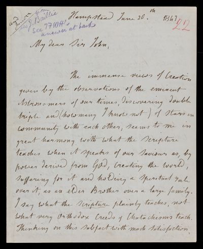 Autograph letter signed by sender. Thanking him for his letter in answer to hers on theological doctrine and its relation to John Frederick William Herschel's observations.