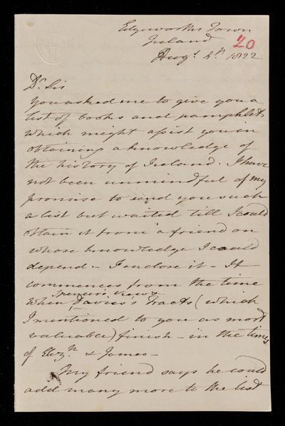Autographed letter, incomplete. Encloses list of books on Ireland as requested. Her brother is in London. Hopes that John Frederick William Herschel will visit them should he come to Ireland.
