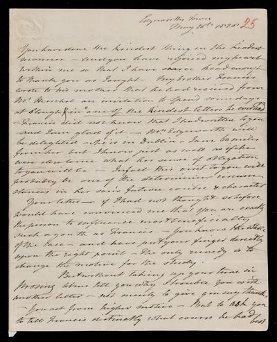 Autograph letter signed by sender. Is grateful for his kindness. Has addressed a letter to her brother c/o John Frederick William Herschel's house but destroy it if he has returned to Ireland.