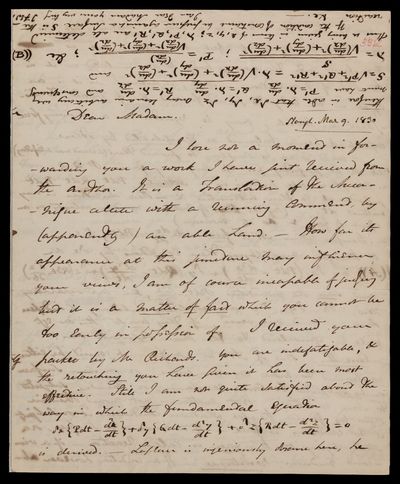 Autograph letter signed by sender. Admires her manuscript [Mechanism of the Heavens]. Wishes [P. S.] Laplace would have lived to see it. Notes a problem with the principle of virtual velocity.