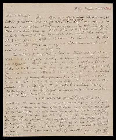 Autograph letter signed by sender. Explains to Mary Somerville P. S. Laplace's method of indeterminate coefficients in mathematics. Thanks Mary Somerville for her praise of his book [Prelim. Discourse], which John Frederick William Herschel values more highly than newspaper reviews.
