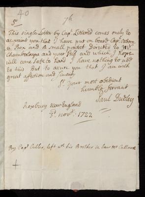 03 November 1722 Sender: Paul Dudley , Paul Dudley Reference number: EL/D1/77