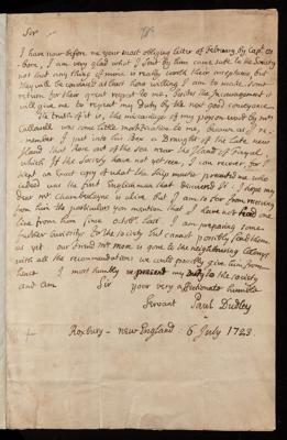 06 July 1723 Sender: Paul Dudley , Paul Dudley Reference number: EL/D1/78