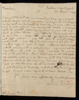 21 December 1725 Sender: Paul Dudley , Paul Dudley Reference number: EL/D1/88