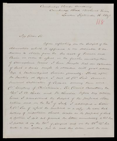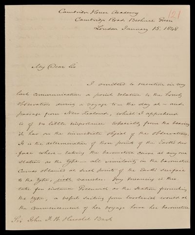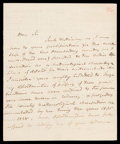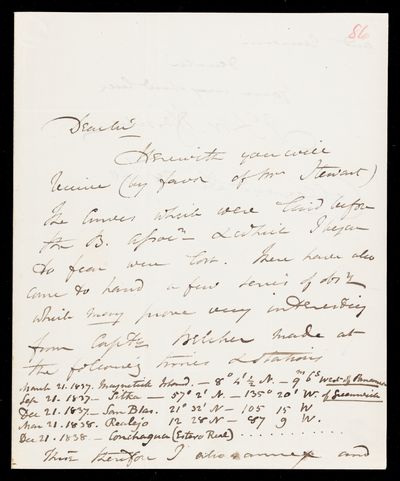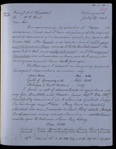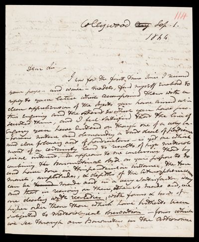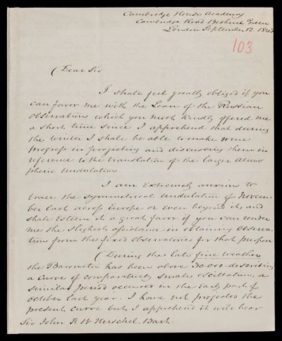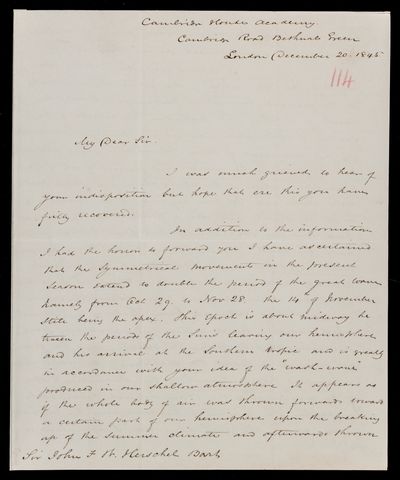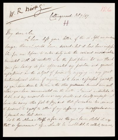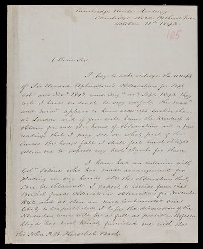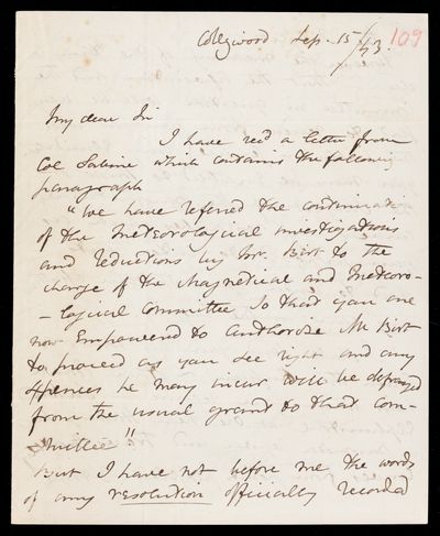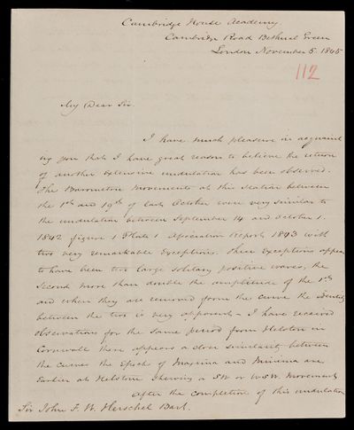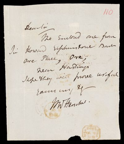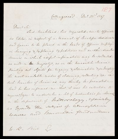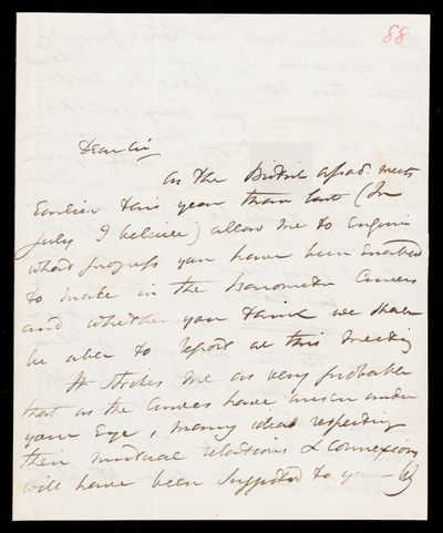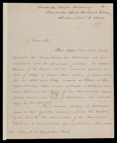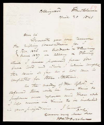 Autograph letter signed by sender. Sends Howard Elphinstone's barometer observations [at Ore, near Hastings].