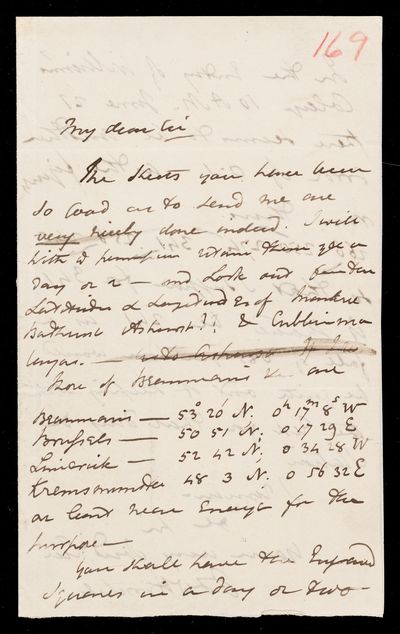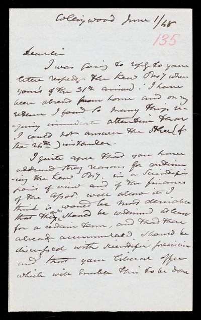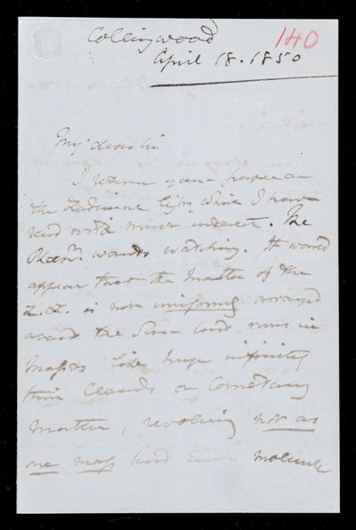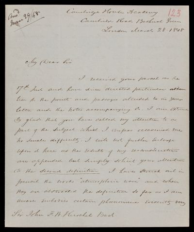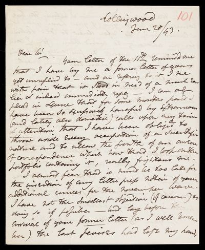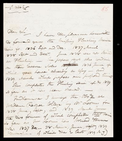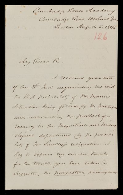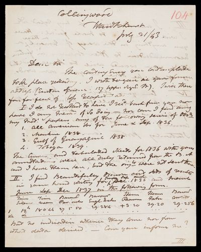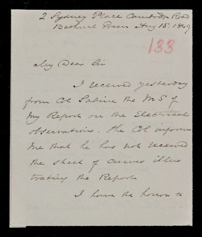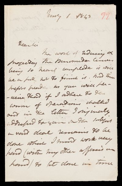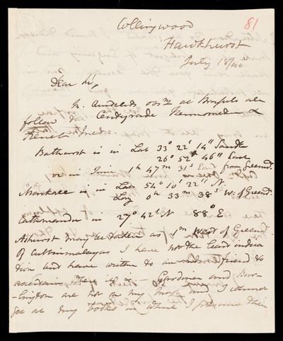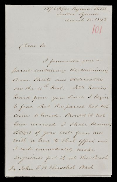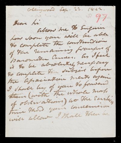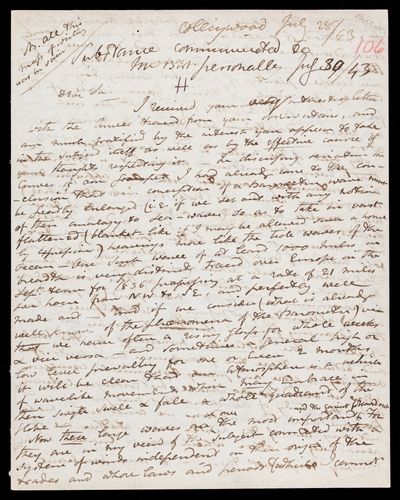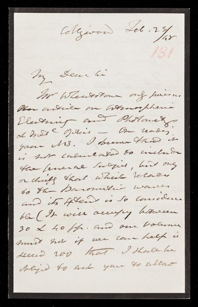 Autograph letter signed by sender. Sends Howard Elphinstone's barometer observations [at Ore, near Hastings].