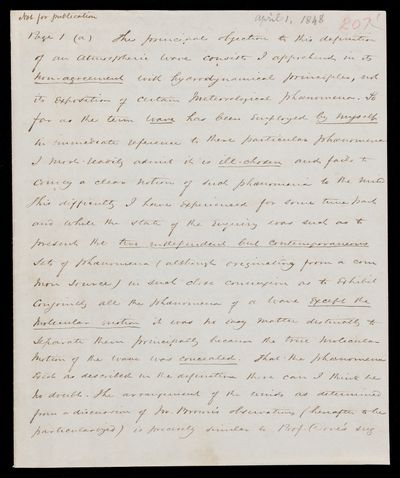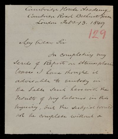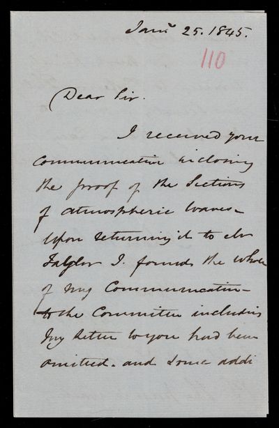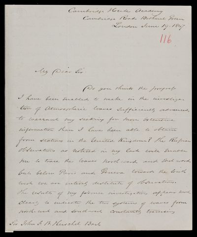 Autograph letter signed by sender. Regarding recent barometric readings and atmospheric waves.