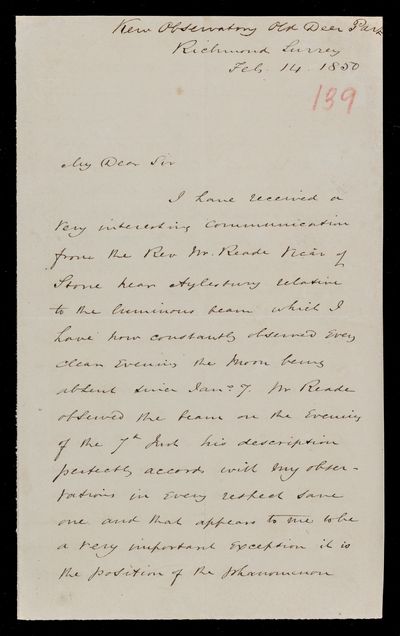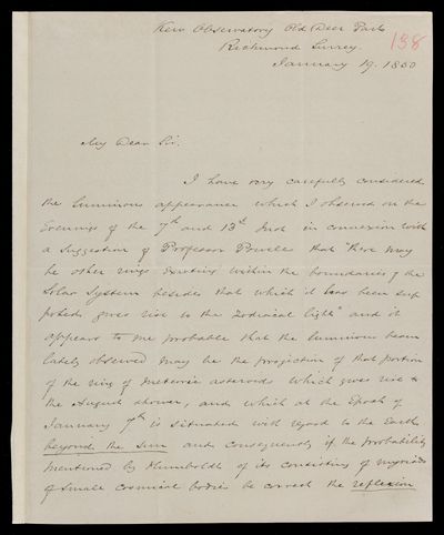 Autograph letter signed by sender. Regarding the luminous rings recently observed in the solar system.