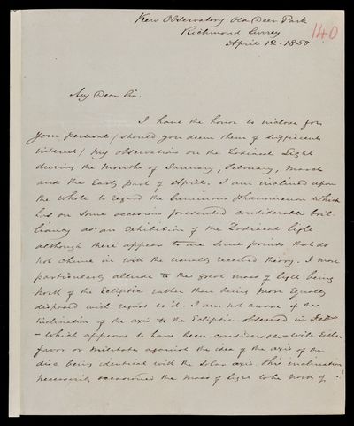 Autograph letter signed by sender. Outlining the influence of the recent aurora on the zodiacal light.