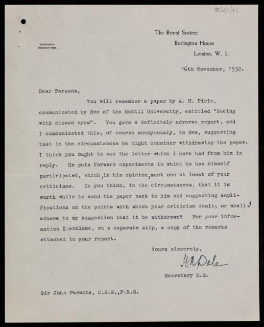 Letter from [Henry] H Dale to Sir John Parsons, regarding a paper 'Seeing with Closed Eyes' by A [Alexander Howard] Pirie