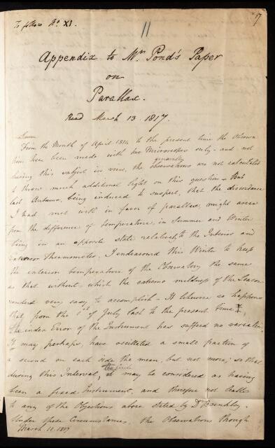John Pond, Paper, 'Appendix to Mr Pond's paper on parallax' by John Pond, 1817, PT/11/11, The Royal Society Archives, London, https://makingscience.royalsociety.org/items/pt_11_11/paper-appendix-to-mr-ponds-paper-on-parallax-by-john-pond, accessed on 12 December 2025