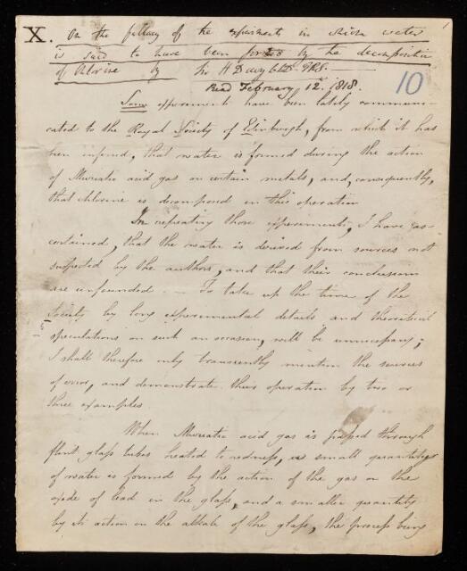 Humphry Davy, Paper, 'On the fallacy of the experiments in which water is said to have been formed by the decomposition of chlorine' by Sir H [Humphry] Davy, 1818, PT/12/10, The Royal Society Archives, London, https://makingscience.royalsociety.org/items/pt_12_10/paper-on-the-fallacy-of-the-experiments-in-which-water-is-said-to-have-been-formed-by-the-decomposition-of-chlorine-by-sir-h-humphry-davy, accessed on 04 December 2025