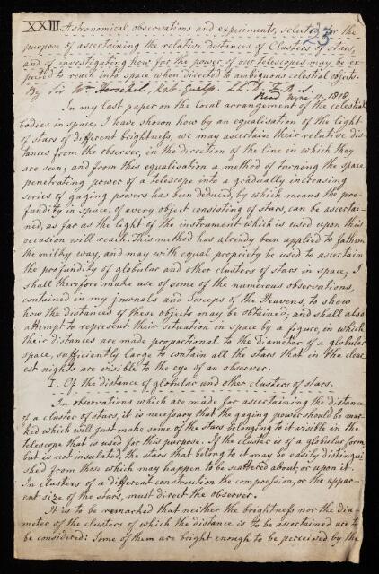William Herschel, Paper, 'Astronomical observations and experiments, selected for the purpose of ascertaining the relative distances of clusters of stars, and of investigating how far the power of our telescopes may be expected to reach into space when directed to ambiguous celestial objects' by Sir Wm [William] Herschel, 1818, PT/12/23, The Royal Society Archives, London, https://makingscience.royalsociety.org/items/pt_12_23/paper-astronomical-observations-and-experiments-selected-for-the-purpose-of-ascertaining-the-relative-distances-of-clusters-of-stars-and-of-investigating-how-far-the-power-of-our-telescopes-may-be-expected-to-reach-into-space-when-directed-to-ambiguous-celestial-objects-by-sir-wm-william-herschel, accessed on 04 December 2025