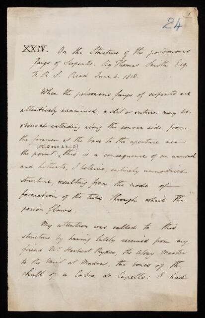 Thomas Smith, Paper, 'On the structure of the poisonous fangs of serpents' by Thomas Smith, 1818, PT/12/24, The Royal Society Archives, London, https://makingscience.royalsociety.org/items/pt_12_24/paper-on-the-structure-of-the-poisonous-fangs-of-serpents-by-thomas-smith, accessed on 04 December 2025